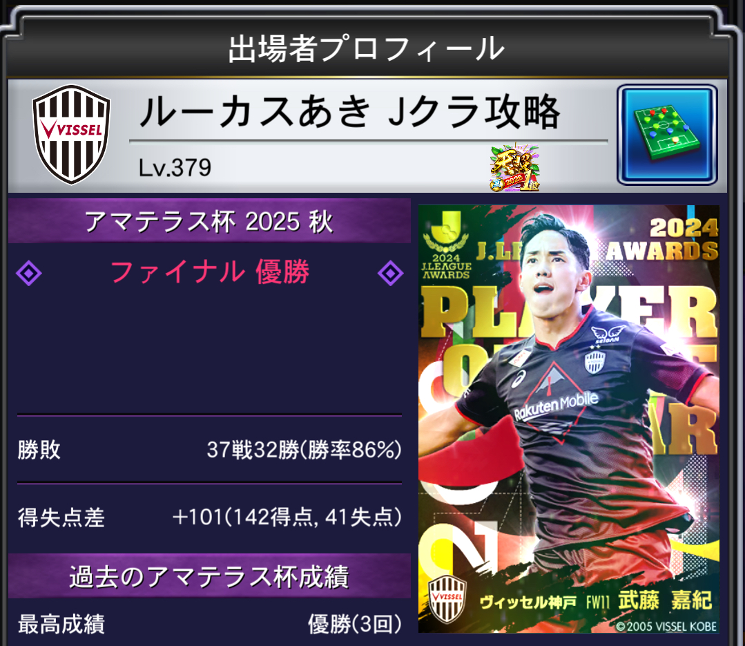 - 実績:Jクラのアマテラス杯で3度優勝(全ユーザー内最多優勝)